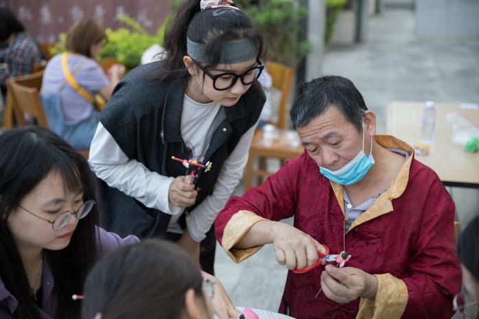 妆糕人泉州市级非遗传承人张明铁的体验课堂同样人头攒动。一团团彩色的面团经过传承人的巧手一番揉、捏、按、搓,再用竹签、剪刀等工具将他们幻化成孙悟空、猪八戒、小猪佩奇、皮卡丘等形象,在场学生也一一体验,其乐融融。