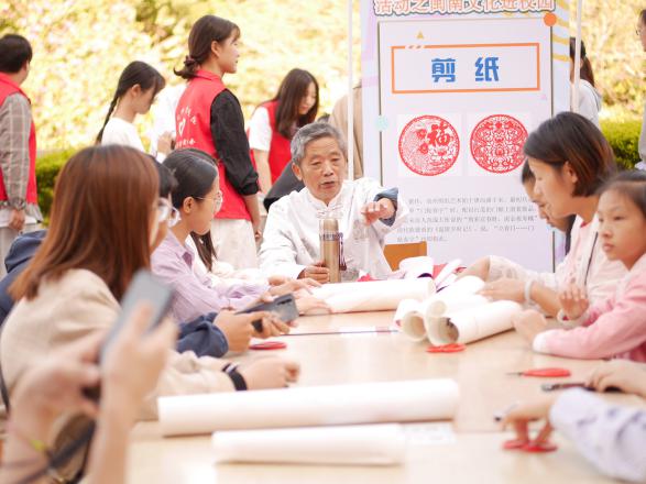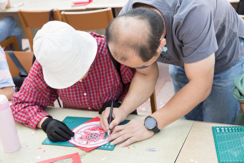 另一边,剪纸和刻纸课堂同样一片欢乐。剪纸泉州市级非遗传承人杨民兴和花灯泉州市级非遗传承人傅草艺一番描、剪、刻、剔,一张张平淡无奇的纸张变出了花样各异的图案,令学生们叹为观止。经过两位老师的指导,学生们也拿起工具,完成一个个剪纸和刻纸作品。