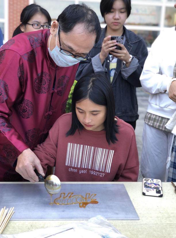 活动一开始,糖画体验课堂便挤满了学生,只见糖画非遗传承人陈学珍将糖加热后在铁板上一阵行云流水,马上就出现了一个个栩栩如生的飞龙、螃蟹、小猪等,令人赞叹不已。参与体验的学生跃跃欲试,在陈学珍老师的指导下纷纷做出了自己喜欢的糖画模样。学生们拿着糖画,仿佛回到了快乐的儿童时光。