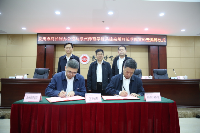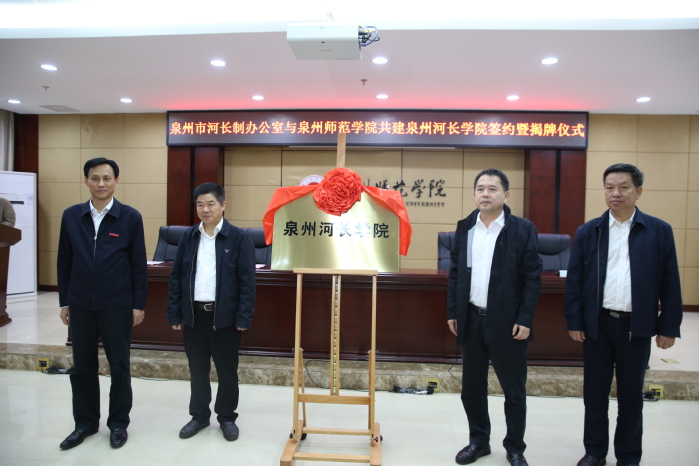 11月26日,泉州市河长制办公室与泉州师范学院举行共建泉州河长学院签约暨揭牌仪式。福建省河长制办公室副主任、省水利厅副厅长游祖勇,泉州市政府副市长肖汉辉,泉州师范学院党委书记朱世泽、泉州师范学院副校长黄江昆,泉州市河长制办公室主任、泉州市水利局局长傅春添出席签约暨揭牌仪式。市河长办、水利局、泉州师院相关职能部门和二级学院负责人、泉州市各县(市)、区河长以及乡镇河长参加仪式。泉州市河长办副主任王逸民主持仪式。