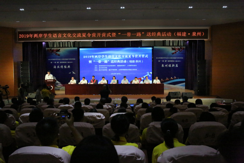 On the morning of July 6th, the Opening Ceremony of 2019 Language & Culture Communication Summer Camp for Students on Both Sides of the Taiwan Straits and “The Belt and Road” Chinese Classics Donation Ceremony were held in No.1 Academic Hall of Special Education Block in Quanzhou Normal University. More than 300 people attended the activity, including Tian Lixin, Director of Department of Language Application & Administration and Department of Language Information Management of the Ministry of Education, Li Xun, Deputy Director of Education Department of Fujian Province, Xiao Hanhui, Vice-Mayor of Quanzhou Municipal Government, Huang Qiang, Party Secretary and Director of People's Education Press, Fang Ming, General Counsel of Chinese Classics Database, Broadcasting Instructor of China Media Group and a famous recital artist, Zhu Shize, Party Secretary of QNU, Qu Guangqing, President of QNU, officials from Department of Language Application & Administration and Department of Language Information Management, Work Committee for Taiwan and Overseas Chinese of the Standing Committee of Fujian Provincial People's Congress, Education Department of Fujian Province, People's Education Press, Quanzhou Municipal Government, Straits Publishing & Distributing Group of Fujian Province, Quanzhou Education Bureau, heads of the relevant functional departments of QNU, and teachers and students of the summer camp. The opening ceremony was hosted by Huang Jiangkun, Vice President of QNU.