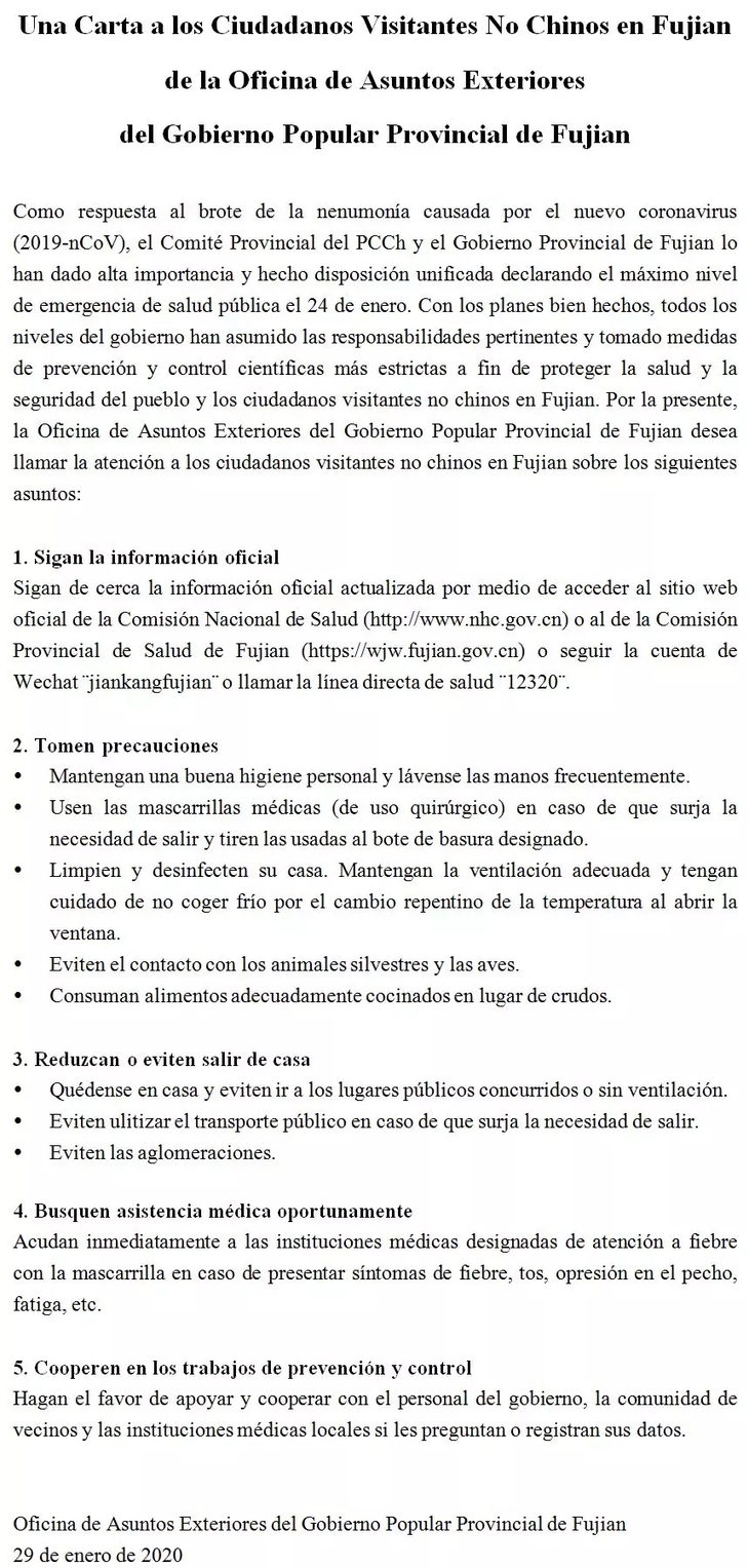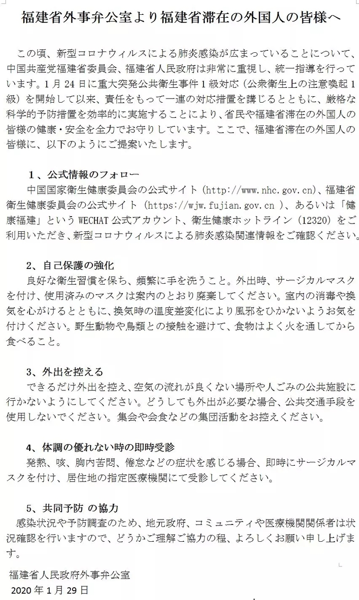 针对近期新型冠状病毒感染的肺炎疫情,福建省委、省政府高度重视,统一部署,已于1月24日启动了重大突发公共卫生事件一级响应,制定周密方案,层层压实责任,确保最严格的科学防控措施落实到位,全力维护人民群众包括在闽外籍人士健康安全。在此,我办谨向在闽外籍人士提出如下倡议: