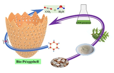 生物纳米课题组成员以具有天然孔道和分层结构的废弃蛋壳为载体,利用植物提取液作为还原剂和保护剂,通过植物还原法制备了鸡蛋壳负载的Pt催化剂(图1)。该催化剂具有多孔的结构、大的比表面积、好的贵金属分散和稳定能力,且其载体廉价易得,催化剂制备条件温和、绿色无污染,将其应用于VOCs催化氧化研究,具有优异的催化活性和稳定性,且通过DFT理论计算探究了其催化反应机理。该材料展示出比单一组份材料更优异的性能,是一类新型的VOCs催化剂材料,将可能在环保领域发挥重要用途,相关论文发表于ACS Applied Materials & Interfaces (中科院一区),泉州师范学院化工与材料学院为第一单位。