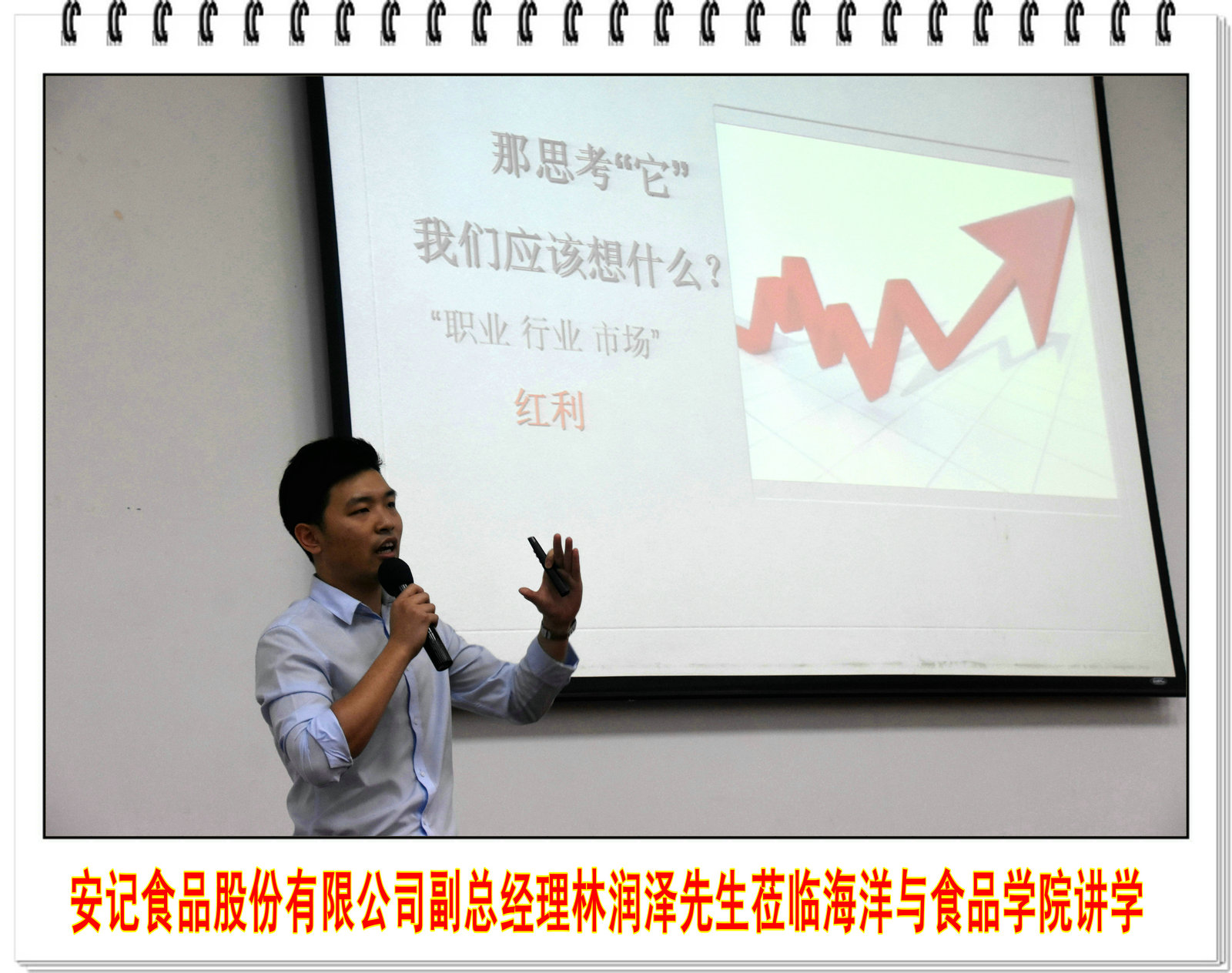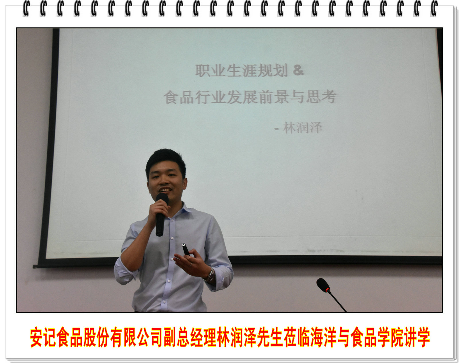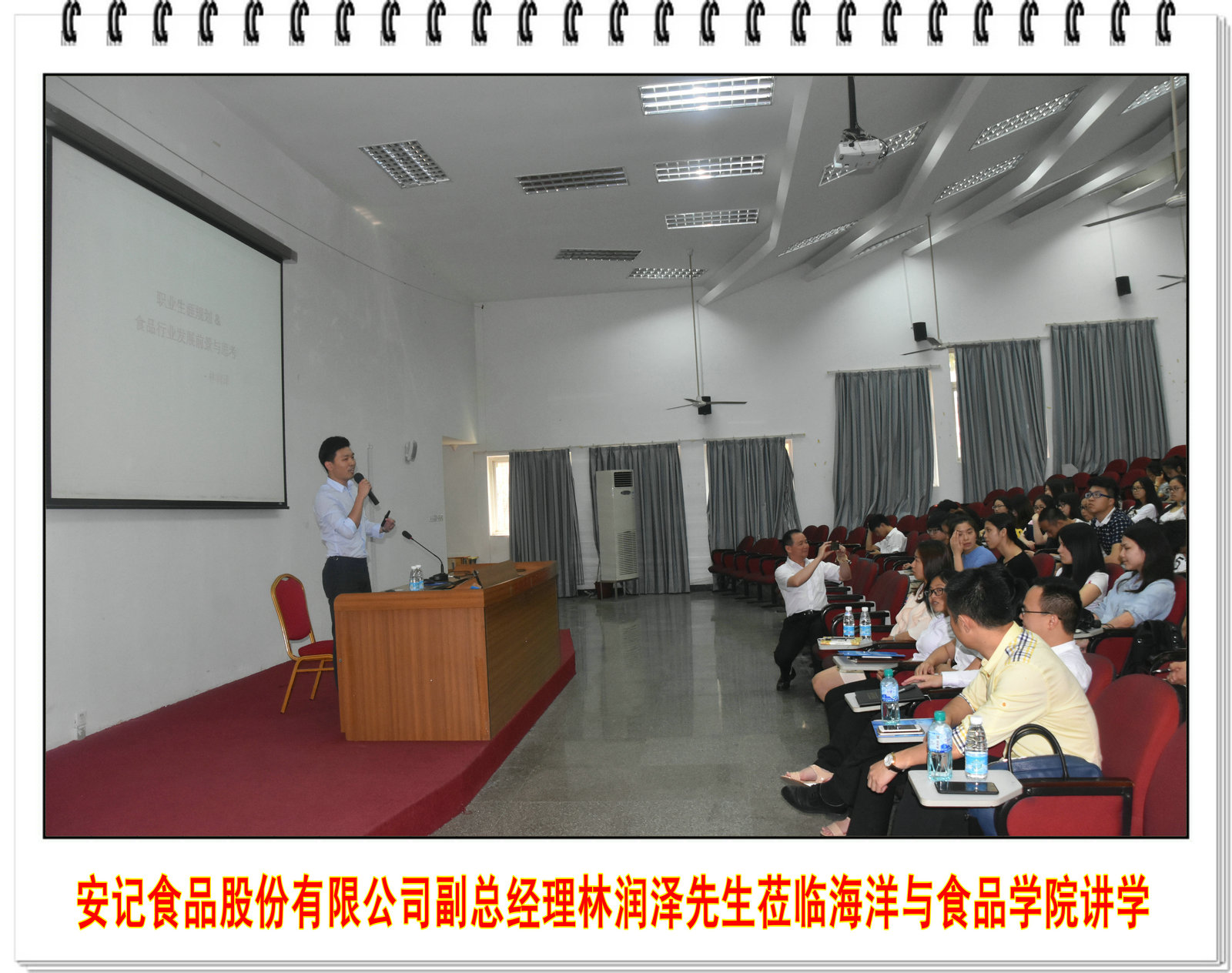 2017年5月5日下午,安记食品股份有限公司副总经理林润泽先生受邀于孙中山一楼学术报告厅做题为“职业生涯规划&食品行业发展前景与思考”的演讲报告。安记食品股份有限公司董事长特别助理杨章华先生等一行7人、海洋与食品学院党委书记蔡英卿教授、海洋食品加工与贮藏科研团队负责人郑宗平教授、成员蔡建秀教授、陈洪彬博士、许明明博士等教师、海洋与食品学院14级和15级食品及生物技术专业学生近200人参加了本次讲座。