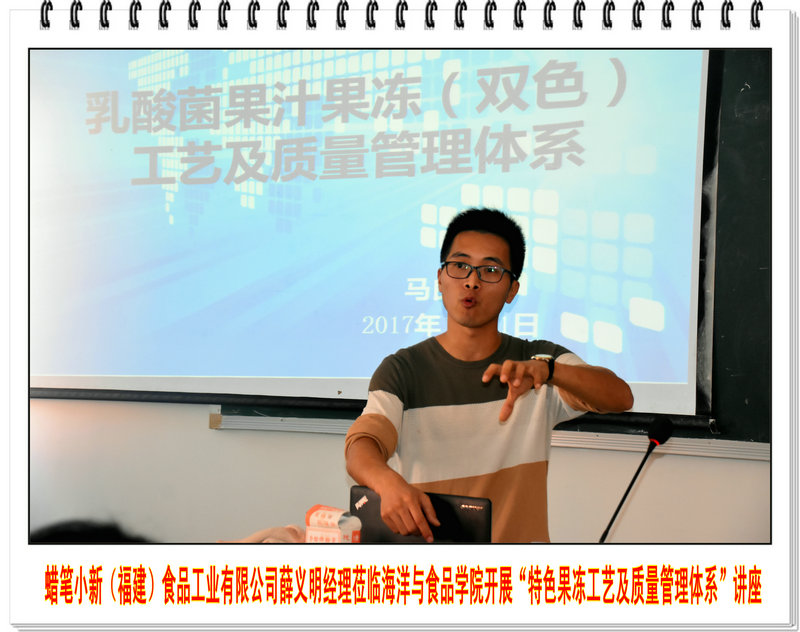 薛义明经理首先围绕“乳酸菌果汁果冻工艺及质量管理体系”这个主题,从产品之初的设计研发到煮料、调配、充填、消烘、包装等工艺环节,深入浅出地阐述了果冻生产工艺的HACCP关键控制点,强调了QMS(质量管理体系)、FSMS(食品安全管理体系)、EMS(环境管理体系)、OHSMS(职业健康管理体系)等4个体系在食品行业中的重要性。