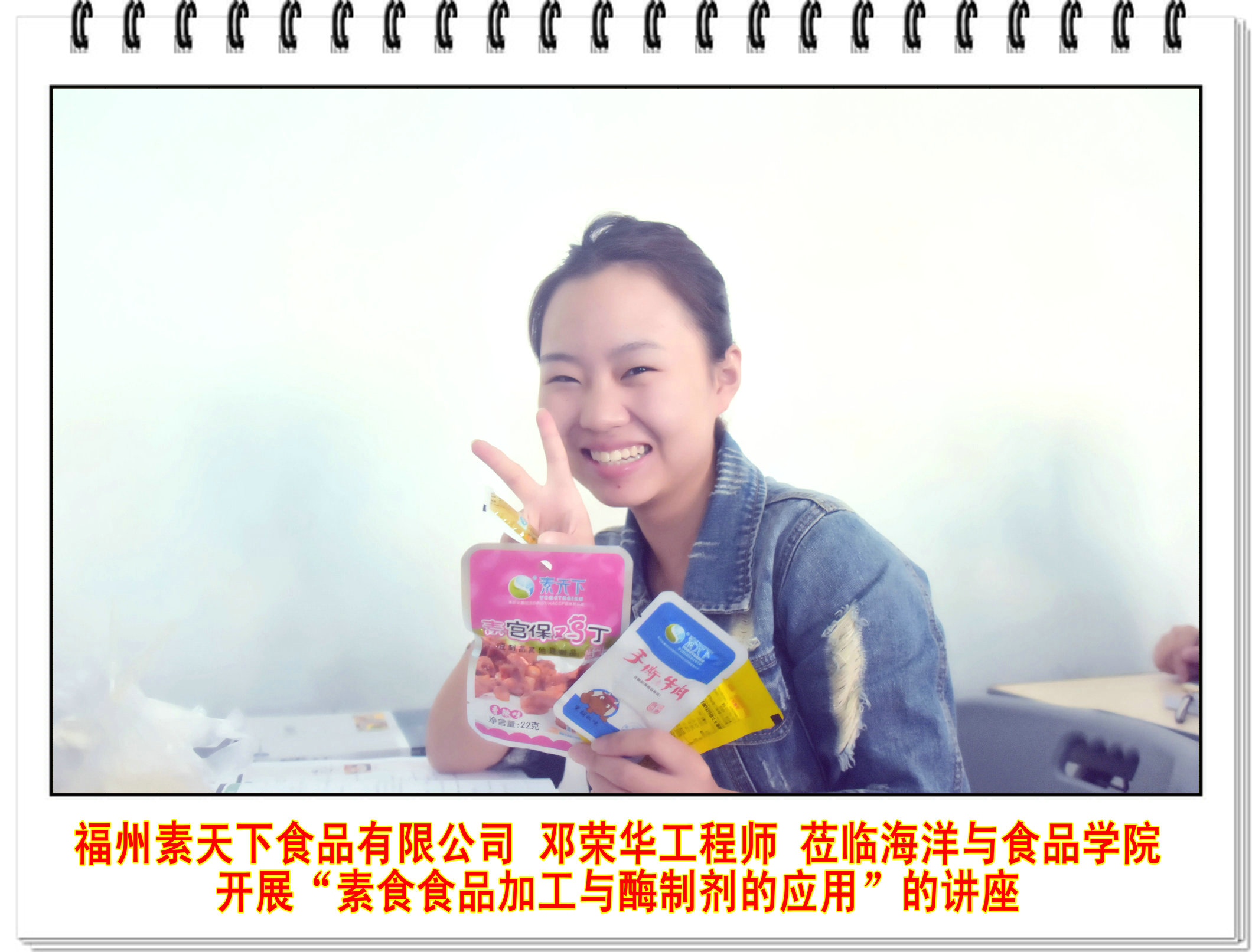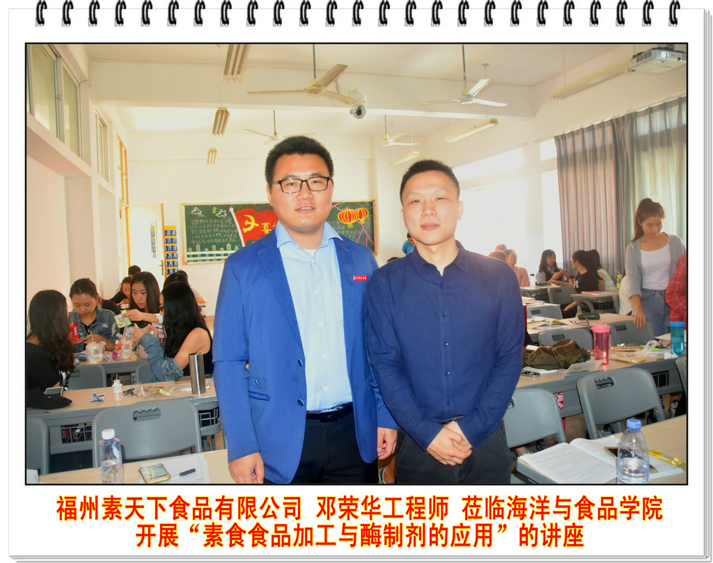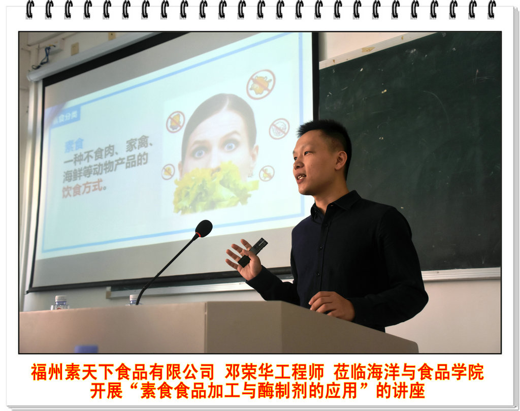 邓工程师从素食的分类、食用素食的意义、素食加工产品简介、素食食品加工工艺、TG酶制剂的应用等方面对素食食品进行全方位的介绍,让同学们对素食食品有了更深一步了解。最后,邓工程师还介绍了第四届“素天下杯”福建省大学创新创意大赛概况,鼓励学生积极参与此次赛事。