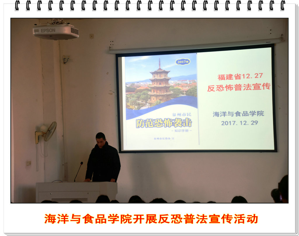 2017年12月29日中午,海洋与食品学院在理工320召开反恐普法宣讲会。学院各专业辅导员以及全体学生参加了会议,宣讲会由辅导员高树政主讲。