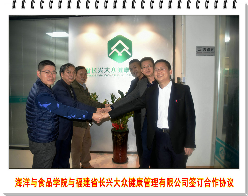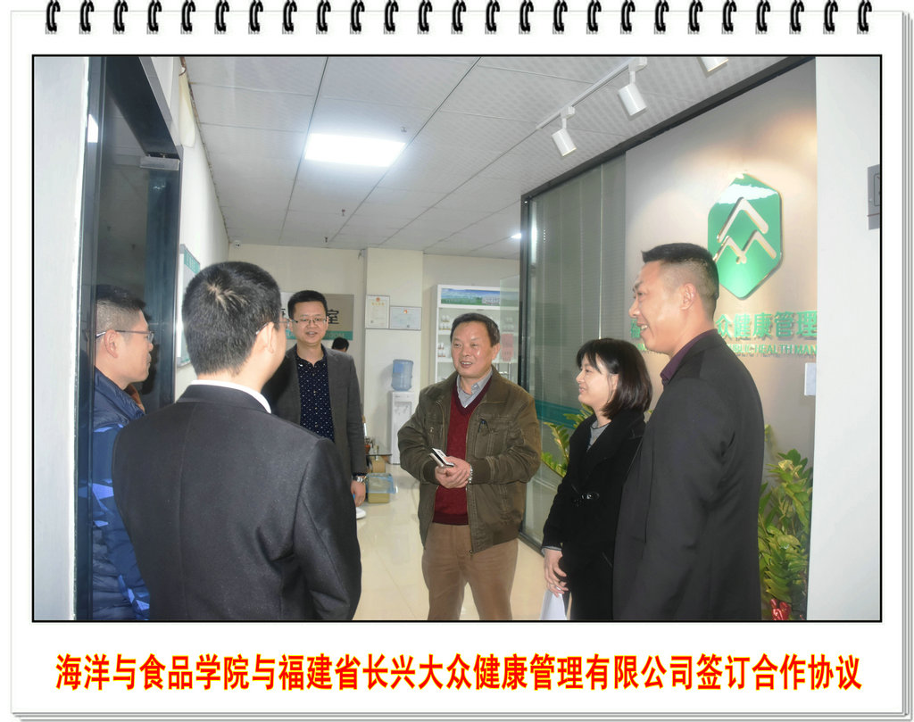 2018年1月8日,海洋与食品学院院长袁建军教授、党委书记蔡英卿教授、食品科学与工程系主任郑宗平教授、院长助理陈洪彬博士等一行到福建长兴大众健康管理有限公司签订共建专业实践基地协议。福建长兴大众健康管理有限公司毛彬、江志杰等参加签约座谈会。双方希望加强联系,拓展合作领域。