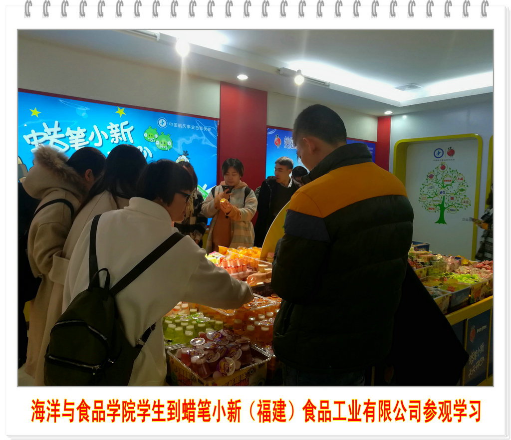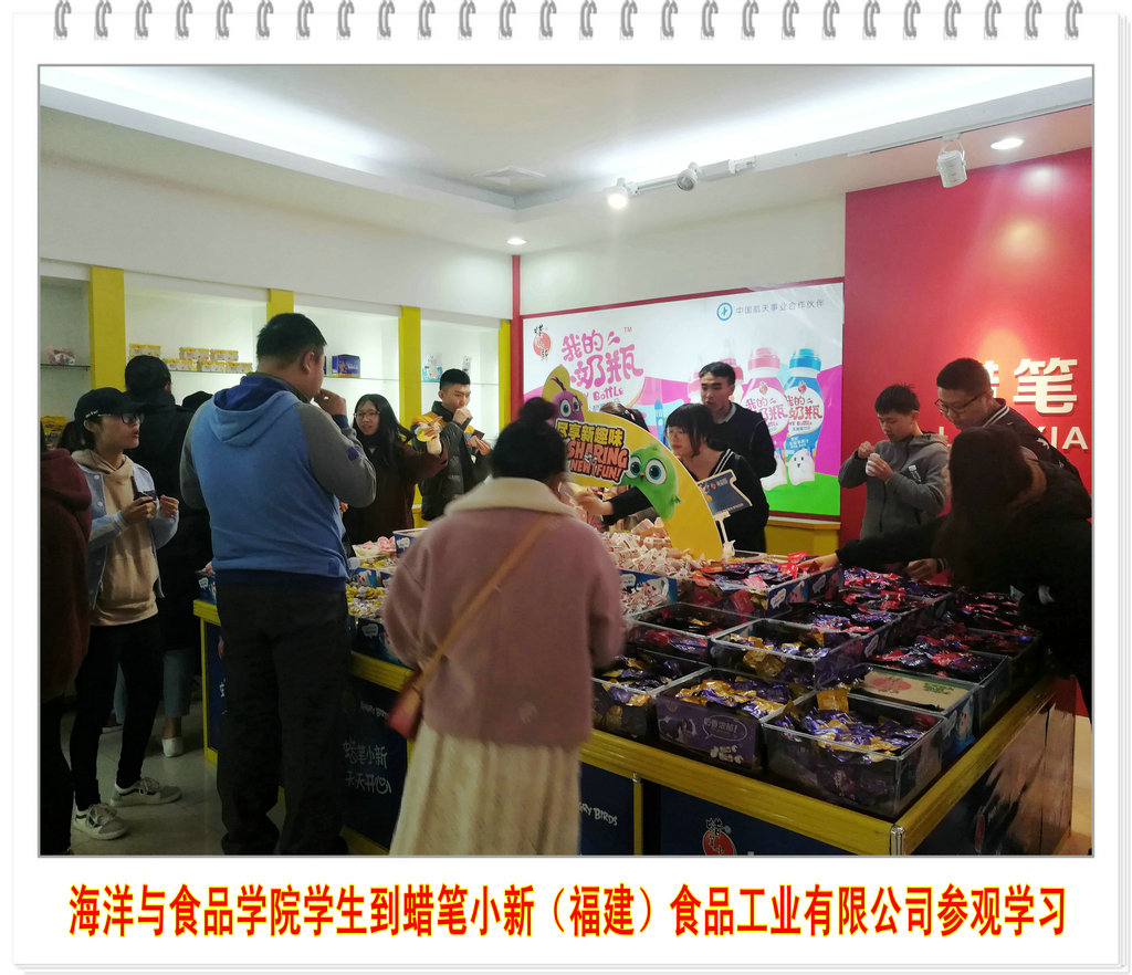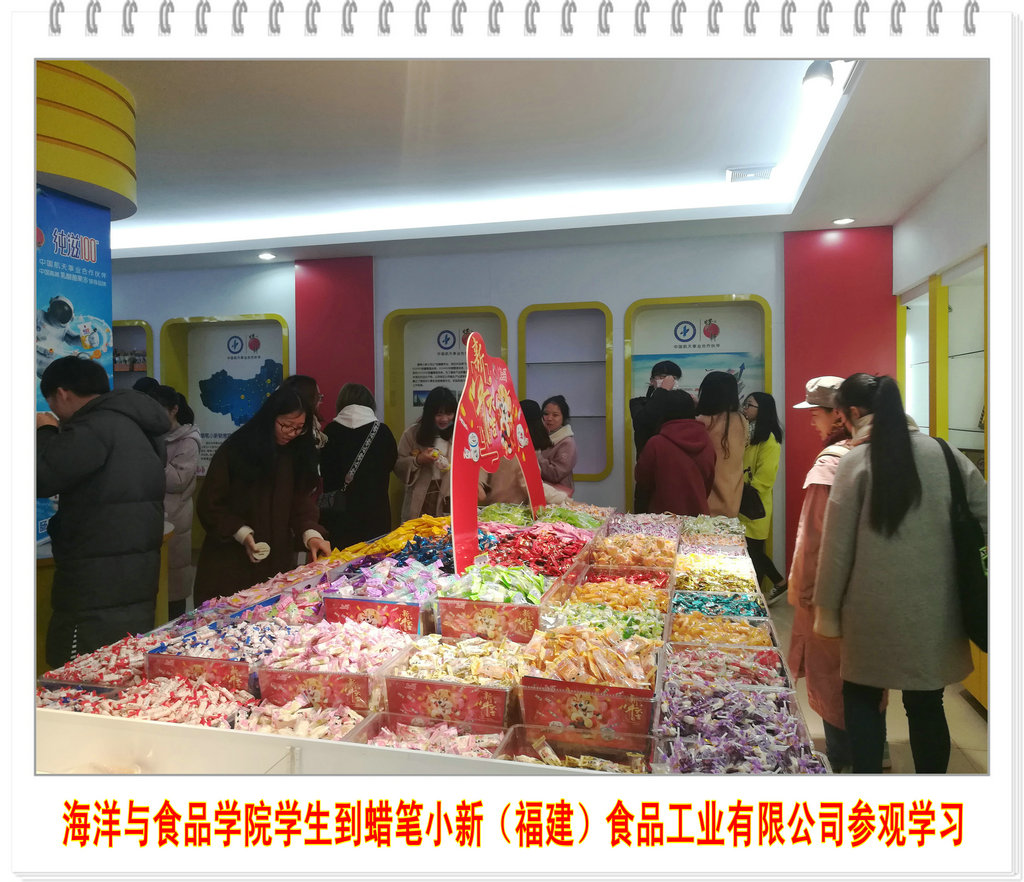 蜡笔小新(福建)食品工业有限公司总经理马良丰和人事行政部经理李建平对同学们的到来表示热烈欢迎。同学们首先参观了蜡笔小新产品陈列室,了解蜡笔小新的发展历程、公司荣誉,还现场品尝了蜡笔小新的各类特色糖果、果冻、乳酸菌布丁、乳酸菌发酵果汁饮料等系列产品,对果冻布丁等休闲食品有了更丰富的感官体验。随后来到公司的果冻生产车间,马良丰总经理亲自为同学们介绍了果冻的生产工艺流程和关键控制点,并对同学们感兴趣的果冻加工设备控制原理进行了讲解。