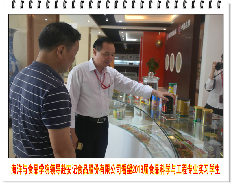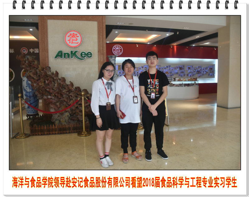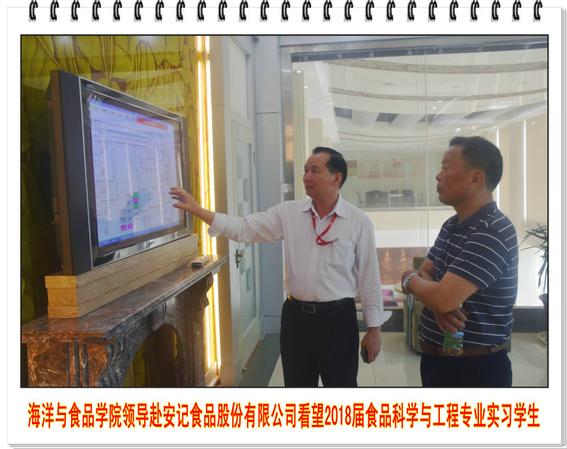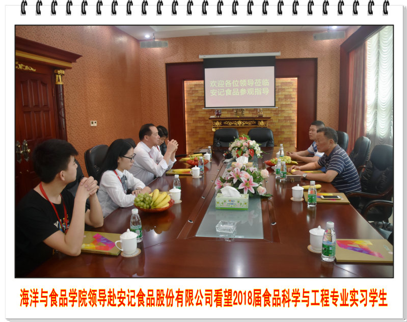 4月23日下午,海洋与食品学院院长袁建军教授和食品科学与工程系主任郑宗平教授到安记食品股份有限公司看望在企2018届食品专业实习生。