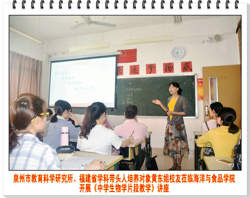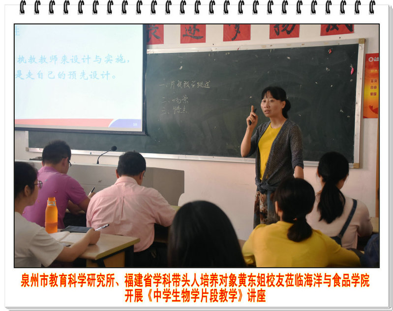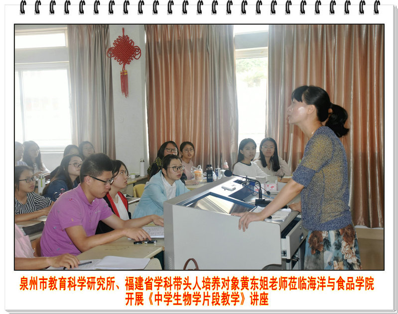 2018年5月10日,泉州市教育科学研究所教研员、中学高级教师、省学科带头人培养对象黄东姐校友莅临海洋与食品学院授课。授课课程《生物教学技术》,授课课题为《中学生物学片段教学》。