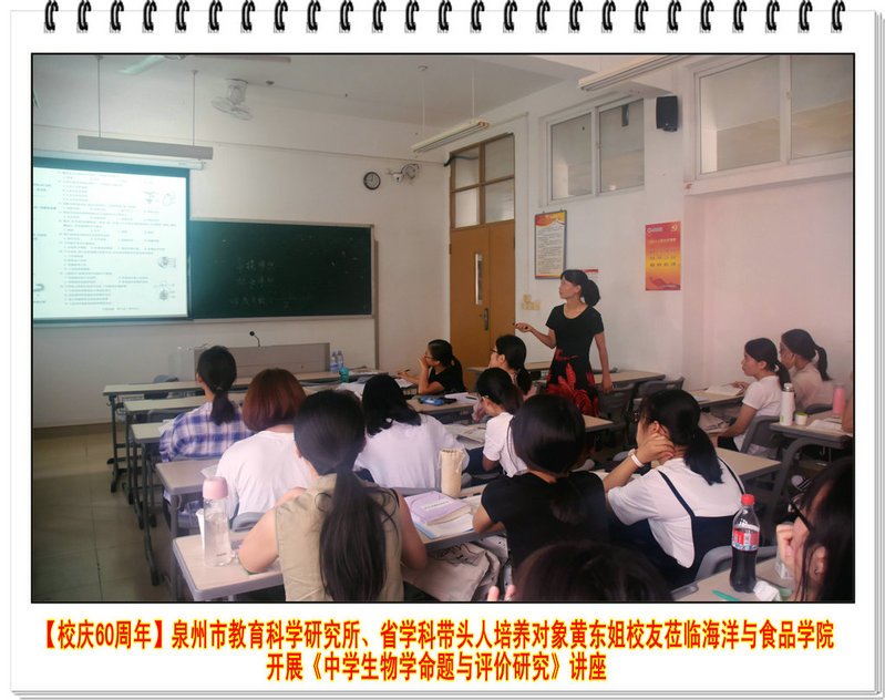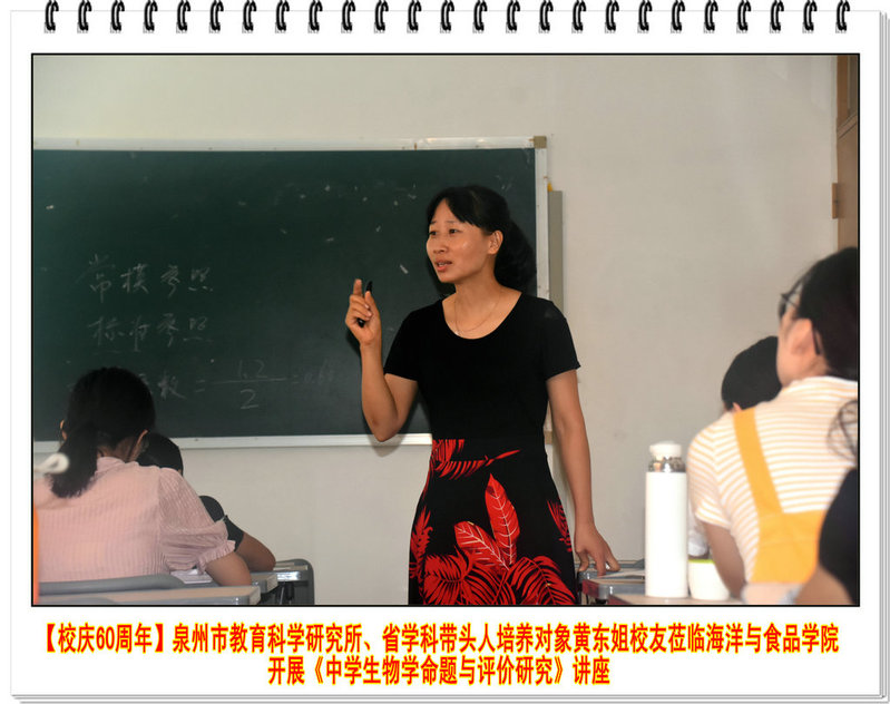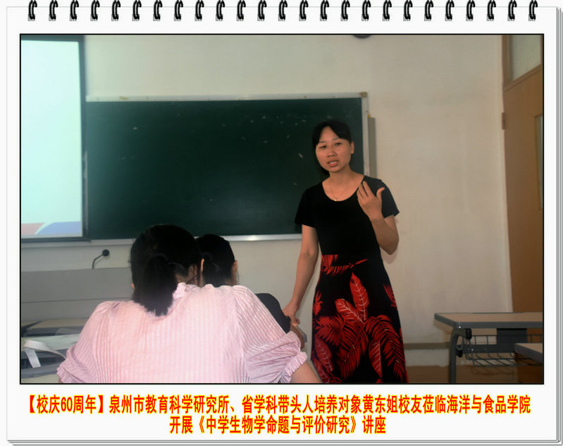 2018年9月中旬,福建省学科带头人培养对象、泉州市教育科学研究所教研员、中学高级教师黄东姐校友受邀两次莅临海洋与食品学院为2015级生物科学专业学生授课,授课主题为《中学生物学命题与评价研究》。讲课精彩,应用性强,为学生在中学生物学命题技术上提供实作性的指导和帮助,深受师生喜爱。