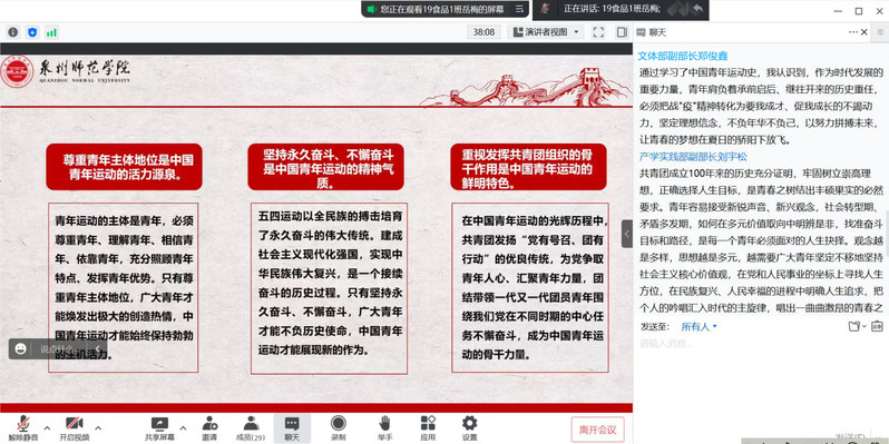 此次培训采用线上形式,学院学生会主席团成员和团委会主席团成员分别作为主讲人,带领学生会成员们进行了“学习中国青年运动史”“学习习近平总书记考察中国人民大学重要讲话精神”“学习全国两会重要讲话精神”“学习《新时代的中国青年》白皮书”“学习《习近平与大学生朋友们》”等5个主题的学习。课堂上,同学们踊跃发言,畅谈感悟,学习氛围十分浓厚。大家纷纷表示,将自觉加强理论学习,坚定理想信念,积极向党组织靠拢,充分发挥学生干部的模范带头作用,努力成长为担当民族复兴大任的时代新人,以实际行动和更优异的成绩迎接党的二十大胜利召开。