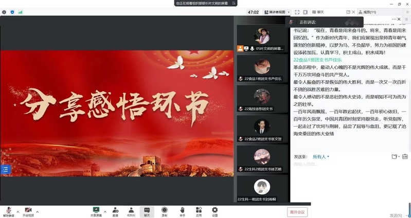 此次培训会以“青春逢盛世,奋进新征程”为主题,采用线上形式开展,学院2022级各团支部书记参加。主讲人叶文莉同学(学院团委会组织部负责人)围绕“团干部工作职责”“学习习近平总书记在建团百年大会上的重要讲话精神”“学习党的二十大精神要义及习近平总书记对青年的青春寄语”三个主题的内容进行了详细生动的讲解。培训会后,2022级各班团支部书记畅谈感受、积极交流。大家纷纷表示收获满满,工作思路更加开阔,对于班级团支部建设有了更加明确的方向。在未来的工作中将不断学习,努力提高政治素质和理论水平,争做班级同学心目中名副其实的“讲解员”和“领学人”。