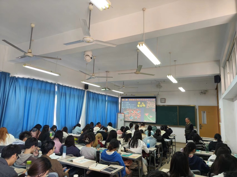 海洋与食品学院院长、生物科学教研室教师袁建军教授讲授了《微生物学》中真核微生物的形态结构与功能相关内容。他首先介绍了真核微生物的基本特征,从细胞结构、代谢特点到功能机制,系统地剖析了真核微生物的多样性与复杂性。接着,他以丰富的实例和图片,生动展示了真核微生物在生态系统中的重要作用及其与人类健康、环境保护等方面的紧密联系。整个公开课内容丰富、思路清晰,让在场的师生们受益匪浅,对微生物世界的神奇和微观生命的奥秘有了更深入的认识。