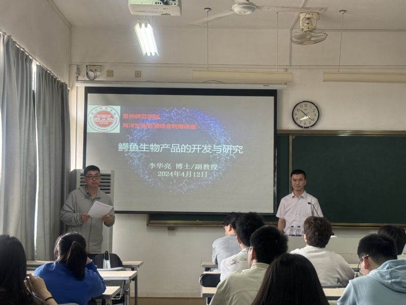 2024年4月12日上午,福建鼍龙实业有限责任公司技术总监李华亮副教授,在理工楼510为我院21级海洋技术专业学生上《海洋生物资源综合利用》课程,主讲内容为:鳄鱼生物产品的开发与研究。