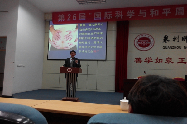 本报讯(记者 何晓敏)2014年10月16日晚,第26届“国际科学和平周”科普走进泉州师院的活动于中山报告厅三楼拉开序幕。本次活动主要由福建省政协委员、农工党福建省委副主委、福建医科大学附属第一医院李笃妙教授为我们做“环境污染与先天畸形”的讲座。李笃妙做过许多畸形婴儿成功治愈的手术,是国内顶尖的儿科专家。