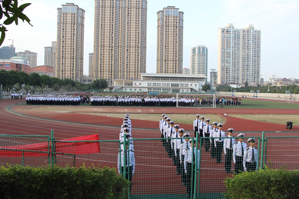 升旗仪式在学生会主席谢佳的主持声中开始。航海学院国旗班的同学护送着鲜艳的五星红旗向升旗台走去。统一的着装、坚实的脚步、整齐的队伍撼动了每一个在场的人。当雄壮的国歌响起时,全体师生庄严肃立,每个人都面向国旗行注目礼。