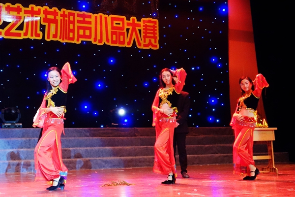 各二级学院参赛队伍为本次大赛都进行了精心的准备,精美独特的舞台装束和跌宕起伏的爆笑情节,带给现场观众阵阵欢乐。其中我院小品《落叶归根》在编排方面新颖独特,小品中穿插性感火辣的印度舞蹈更是吸引了所有人的眼球。演员们精湛的表演技巧,幽默风趣的语言和丰富的面部表情在逗乐全场观众的同时也得到了评委老师的好评.。
