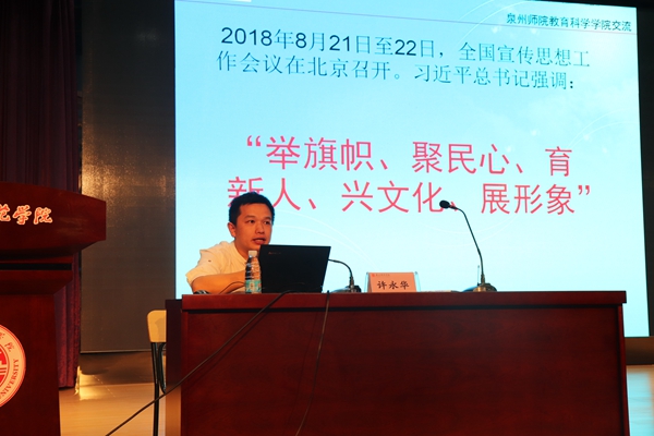 10月27日下午,教育科学学院在特教大楼第一学术报告厅举办教育科学学院第十二届学生干部培训班系列培训之校园新闻基础写作与实践讲座。本次培训由泉州晚报记者、编辑许永华担任主讲人。