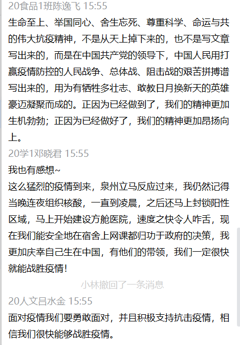 此次活动共分为三个部分。第一部分是组织学习《论中国共产党历史》《习近平新时代中国特色社会主义思想学习问答》《中国共产党简史》等党史相关书籍,从崇尚英雄、青年当有为、伟大抗疫精神等三个方面为出发点,围绕中国共产党始终秉承人类命运共同体理念,在世界各国疫情防控中作出的巨大贡献这一观点展开,鼓励同学们从中学习生命至上、举国同心、舍生忘死、尊重科学、命运与共的伟大抗疫精神。第二部分是组织观看2部抗疫小短片,分别是《献给每一个抗击疫情的中国人》和《八闽同心,泉州加油》,让同学们直观地感受到自新冠疫情爆发以来,中国人民为抗击疫情做出的不懈努力,以及对这次的泉州疫情中为我们负重前行的医疗工作者、老师和志愿者表示感谢。第三部分是组织读书社成员就本次活动分享心得体会。