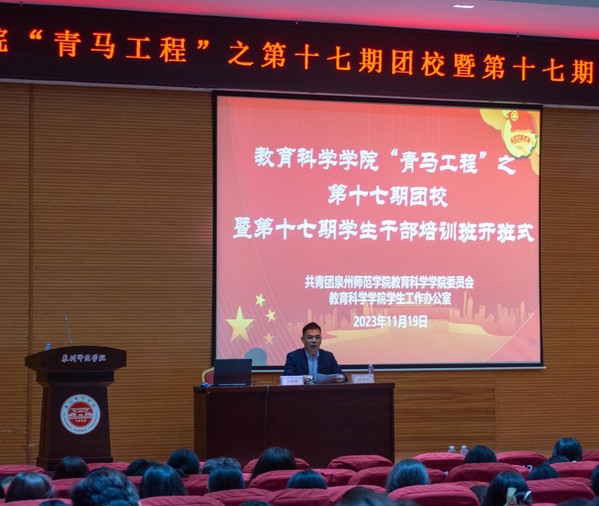 11月19日,教育科学学院2023年秋季“青年马克思主义者培养工程”培训班暨教育科学学院团校第十七期学生干部培训班于特教大楼第二学术报告厅开班。培训班旨在学习贯彻习近平新时代中国特色社会主义思想以及习近平总书记关于青年工作的重要思想,持续深化“青马工程”,在广大青年中培养一批坚持不懈地用社会主义核心价值体系和马克思主义中国化的最新成果武装自己的青年马克思主义者。院党委副书记刘宗安、团委书记林翠玲以及团委各委员老师们出席本次开班仪式。
