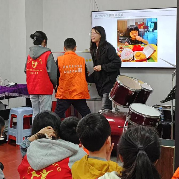 随后,支部同学组织孤独症儿童前往附近的麦当劳餐厅。在餐厅里,学生们有序排队、仔细研究菜单,自信地向工作人员表达点餐需求,成功完成点餐。在安全可控的环境中,这种沉浸式的现场实践教学让他们能将课堂所学知识运用到实际,不仅提高了社交能力,还切实体验到点餐的乐趣,增强了自信心。