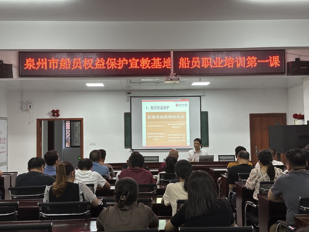 揭牌仪式后,交通与航海学院与泉州海事局联合开讲“船员职业培训第一课”,为近百名商船渔船船员、船员家属、航运公司岸基人员集中授课,内容涵盖海洋强国与船员作用、国际公约法规知识、船员职业生涯规划、船员职业道德、船员防诈骗知识、船员权益保障和救济渠道等。