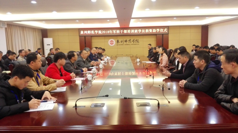 1月4日下午,在泉州师范学院行政办公楼201会议室举行2018军转干部培训班学员捐资助学仪式。泉州师范学院学生处负责人及其资助管理科工作人员,继续教育学院负责人及相关教师、军培班学员及受资助学生到场参加仪式。
