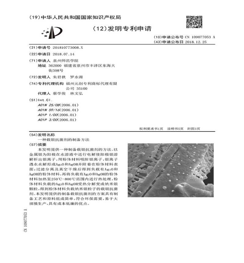 发明专利(专利号:201810773008.X),专利名称:一种载银抗菌剂的制备方法。发明专利(专利号:201811352960.9),专利名称:一种用于苯催化氧化的Pt基催化剂的制备方法。