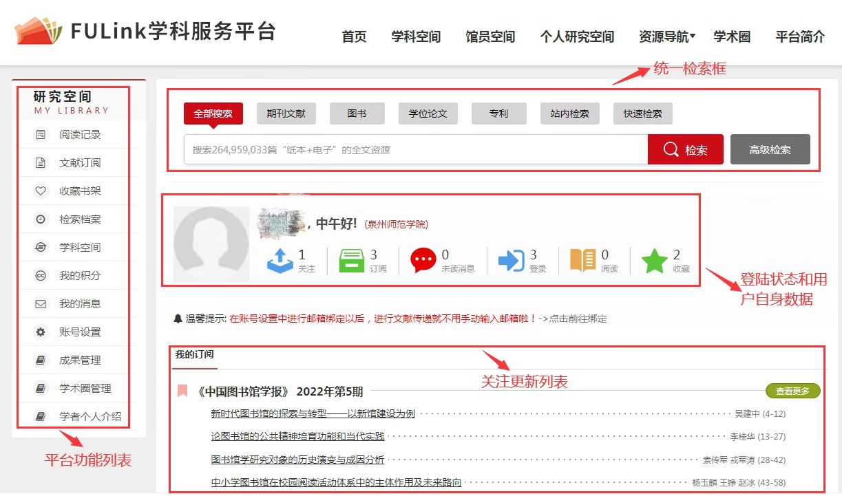 FULink学科服务平台是由福建省高校数字图书馆建设的科研和学习服务平台,以用户为中心,以各成员馆的文献资源为依托,以各成员馆的学科馆员为主体,以大数据分析与精准信息分发为手段,为用户文献检索、文献获取、文献管理、论文投稿等科研过程提供专业的、个性的、精准的、泛在化的科研过程支持服务。该平台支持PC端和移动端,多屏服务,同一账号,同一数据,泛在学习更轻松。