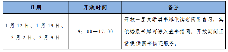 (2)1月21日(除夕)—1月27日(正月初六)春节期间图书馆闭馆。给读者造成的不便,敬请谅解!