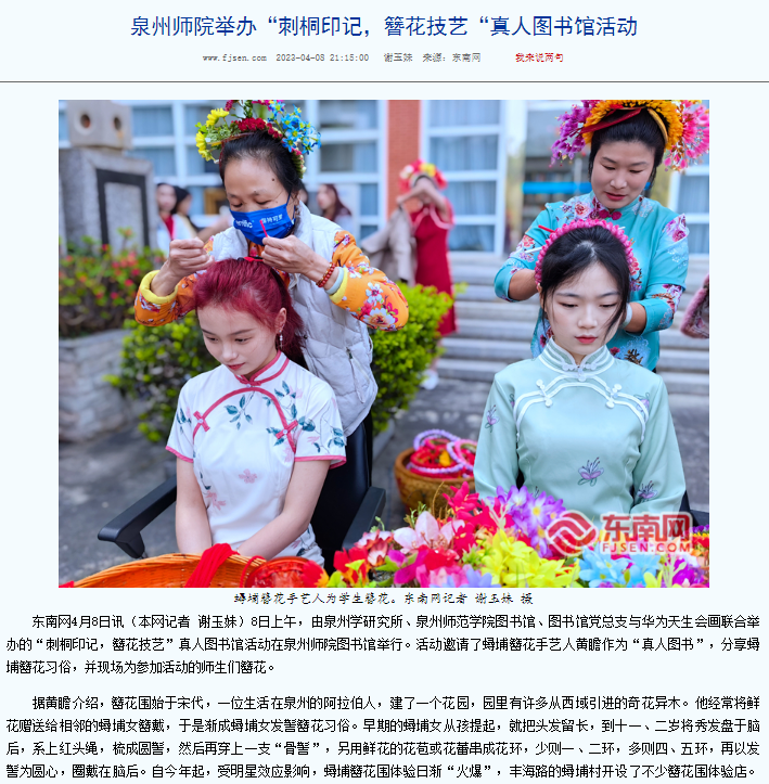 由泉州师范学院图书馆、图书馆党总支、泉州学研究所与华为天生会画联合举办的“刺桐印记簪花技艺”真人图书馆活动4月8日上午在我校图书馆成功举办。