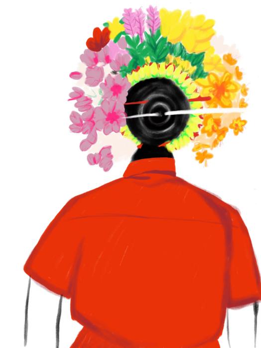 本期活动邀请了黄瞻女士作为真人图书,为我校师生分享蟳埔簪花习俗,并现场为参加活动的老师同学们簪花。黄瞻女士简要介绍了簪花围的历史脉络。簪花围始于宋代,有位生活在泉州的阿拉伯人,建了一个花园,园里有许多从西域引进的奇花异木。他经常将鲜花赠送给相邻的蟳埔女簪戴,于是渐成蟳埔女发髻簪花习俗。早期的蟳埔女从孩提起,就把头发留长,到十一、二岁将秀发盘于脑后,系上红头绳,梳成圆髻,然后再穿上一支“骨髻”,另用鲜花的花苞或花蕾串成花环,少则一、二环,多则四、五环,再以发髻为圆心,圈戴在脑后。