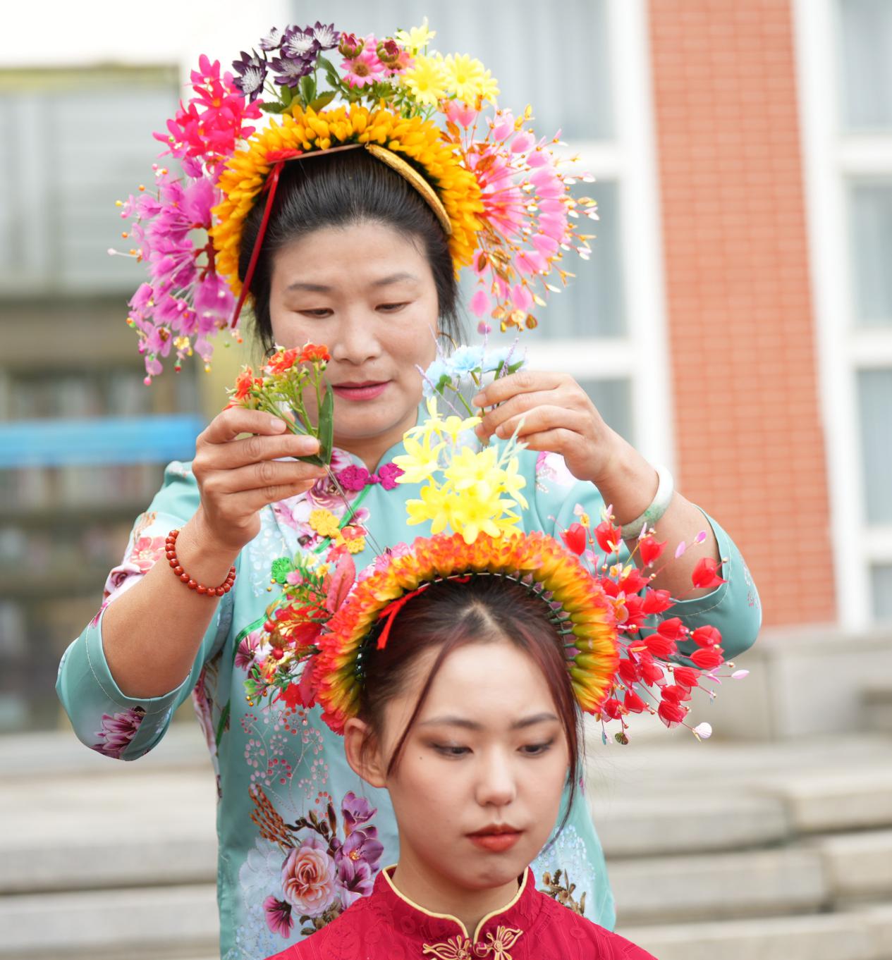 黄瞻女士还为在场的师生进行体验式簪花,进行现场要点教学,动作要领指导,分解每一个步骤,寓教于乐,为师生上了一堂生动的非遗技艺课。