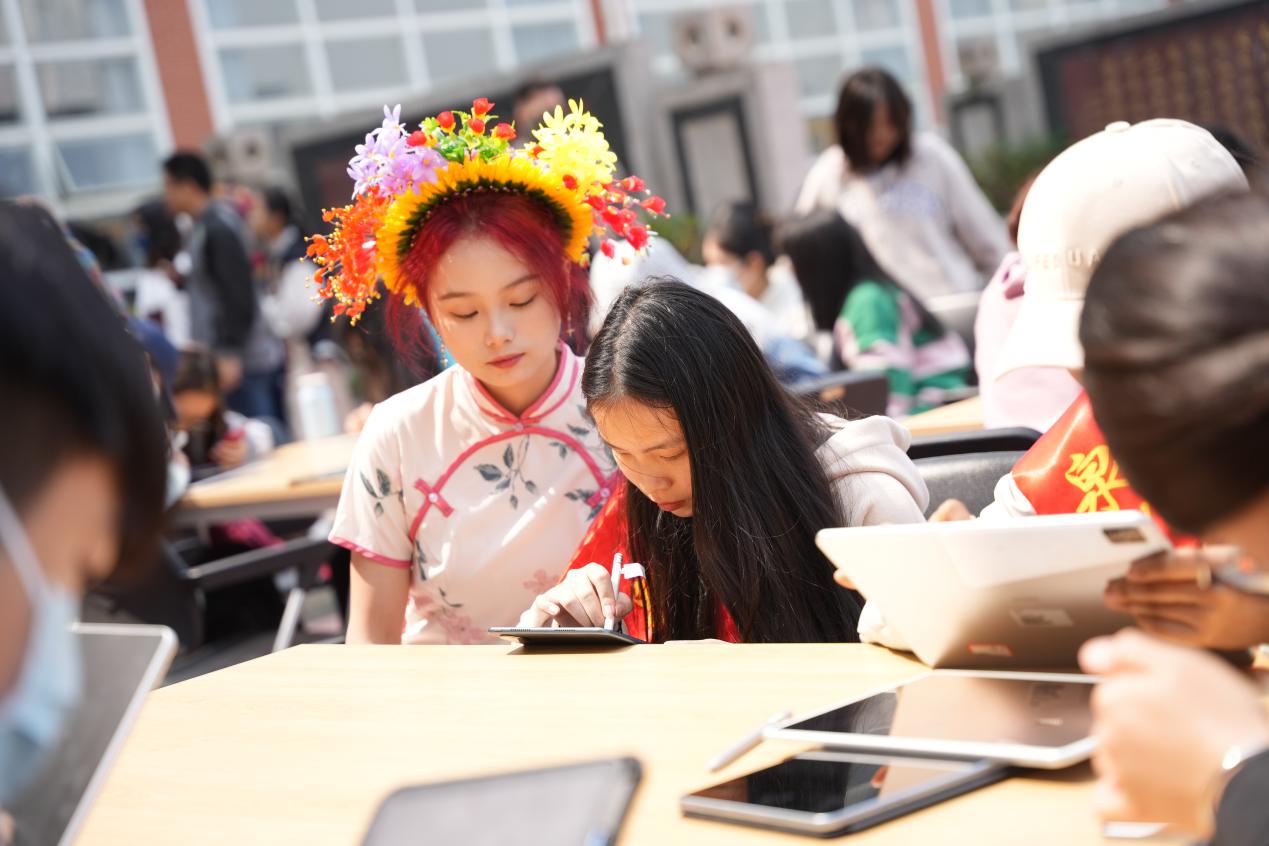 在活动现场,图书馆还联合华为天生会画举办了一场“簪花绘画秀“。华为天生会画将科技带入非遗,让学校师生在体验簪花的同时,通过平板绘画将这一非遗传承技艺记录了下来,以创新、有趣的方式为广大师生带来非遗之美。