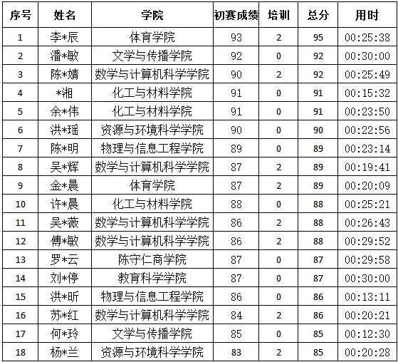 备注:初赛成绩按参赛者答卷分数从高到低排序,出席培训各加2分,总分同一分数出现多名同学的情况则按答题用时排序,用时最短者胜出。