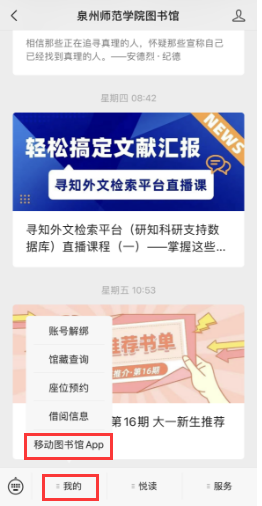 关注图书馆微信公众号后,在左下角“我的”栏目中点击“移动图书馆APP”进行下载,如下图所示。