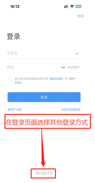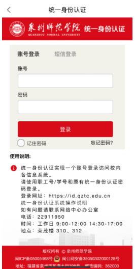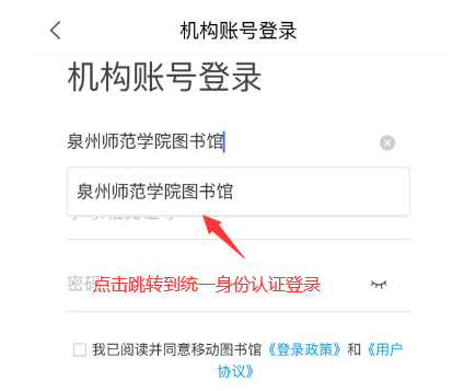 打开移动图书馆APP,在登录界面选择其他方式登录,输入单位名称:泉州师范学院图书馆,跳转统一身份认证账户登录界面,输入统一身份认证账号密码即可登录。如下图所示。