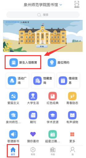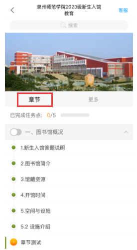 登录成功后,页面会自动跳转到图书馆页面。点击“新生入馆教育”开始闯关学习。如未跳转请点击首页切换到泉州师范学院图书馆的界面。进入新生入馆教育页面后,点击章节进行闯关学习。