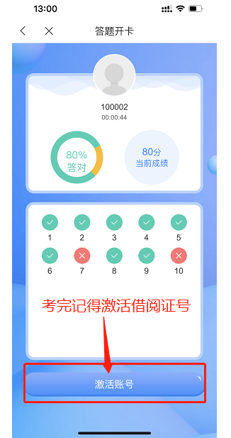 通过入馆教育学习,初步了解图书馆概况、入馆须知、馆藏资源利用等相关知识后,最后章节为新生入馆答题测试,检验各位读者的学习效果。测试成绩达80分以上即可激活账号,开通借阅权限。