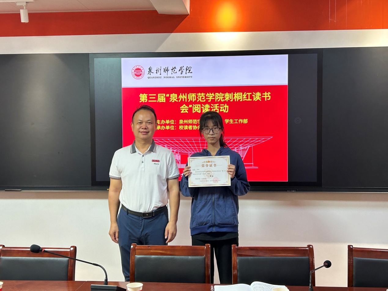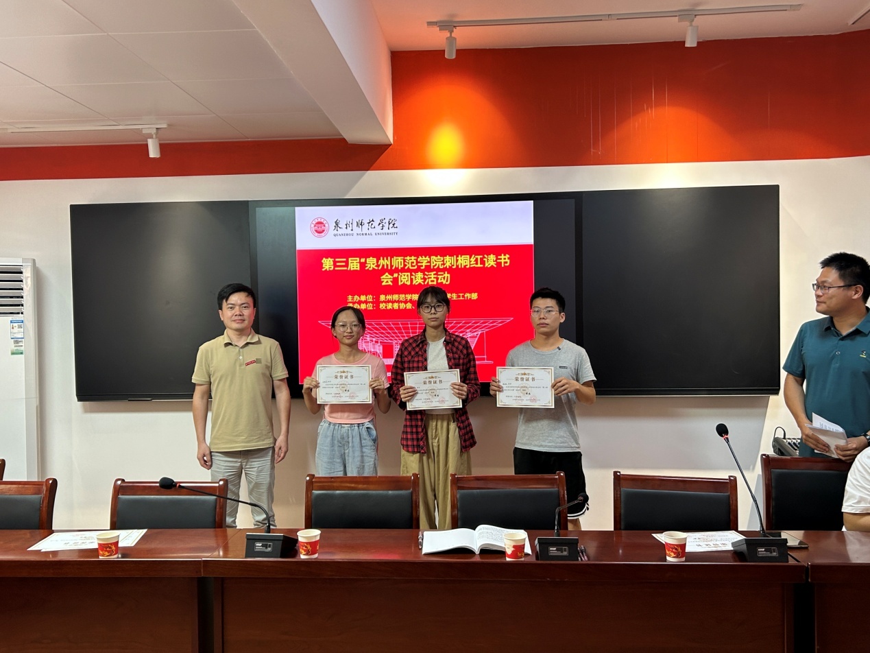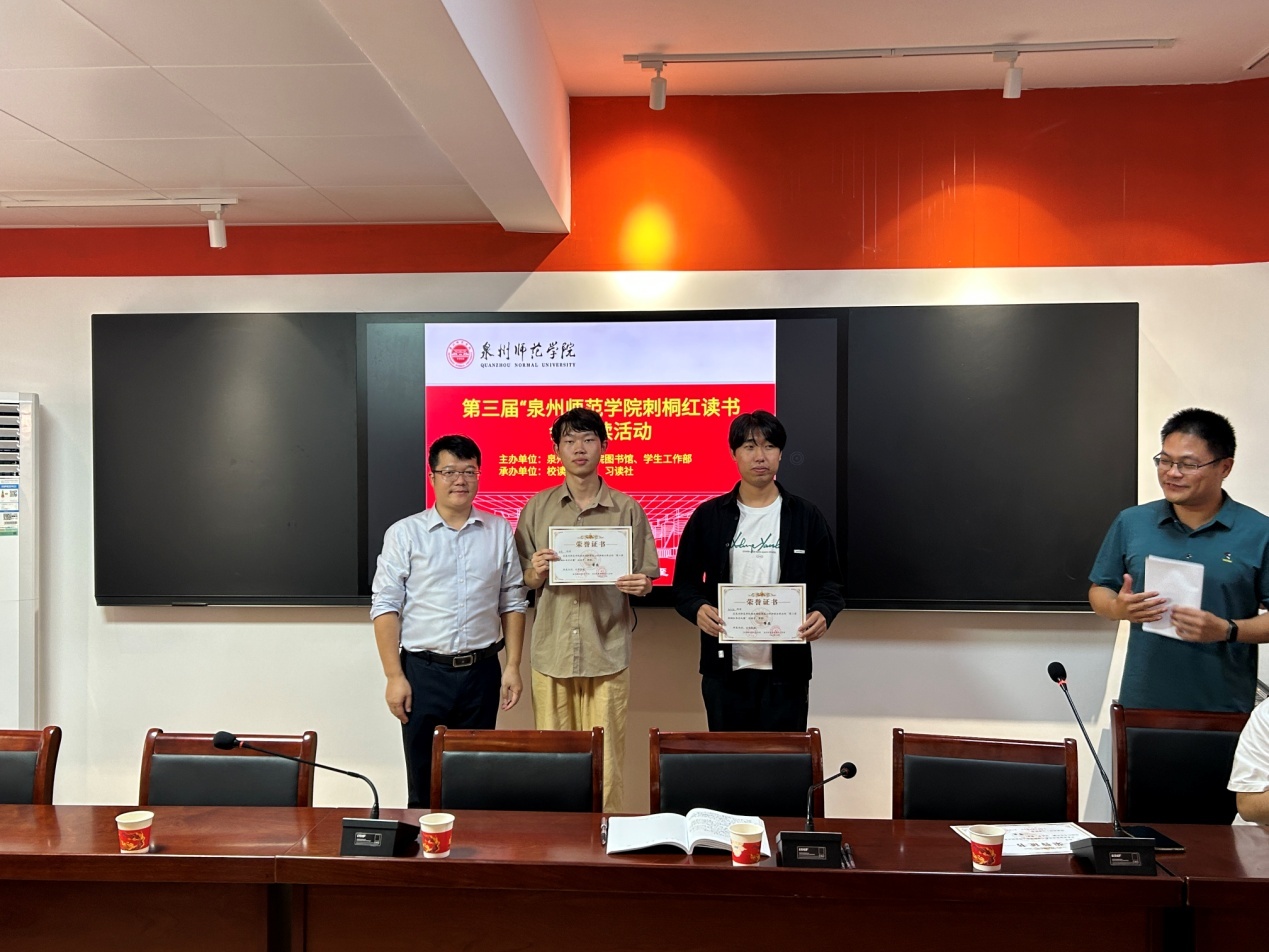 陈彬强对第二届“刺桐红书评比赛”的获奖作品进行点评。尤建军、洪小华、陈钦明为获奖同学颁发荣誉证书。