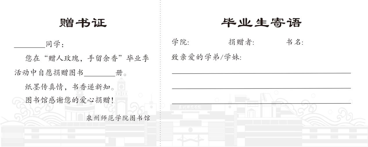 图书馆鼓励毕业生积极捐赠图书,为母校创造良好的书香氛围。捐赠的图书应当是品相较好、内容积极向上的正式出版物(不含期刊杂志)。捐赠者均可获得图书馆定制的毕业生捐赠纪念卡。