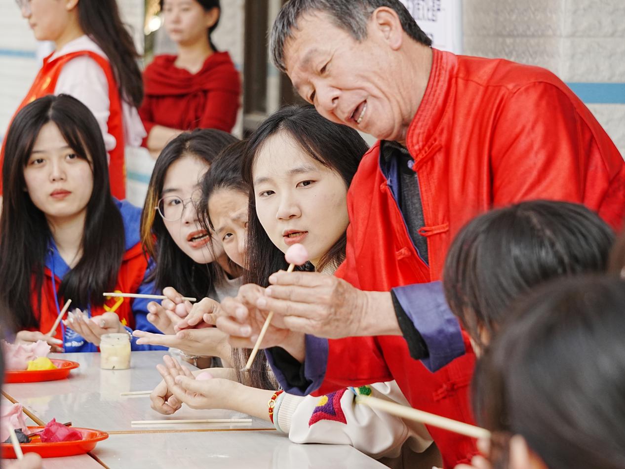 活动现场气氛热烈,非遗技艺的魅力令人目不暇接。妆糕人传承人张明铁老师以巧手捏制出栩栩如生的彩色人偶,引得师生连连赞叹;糖画传承人陈学珍老师以糖浆为墨,在案板上勾勒出花鸟鱼虫等灵动图案,甜香四溢;漆扇传承人刘璟耀老师以水为媒,通过波纹将漆料晕染出独特纹理,再转印至扇面,形成一件件绚丽的艺术品;珠绣传承人陈克忍老师以针线串起五彩珠片,在布面上绣出闽南传统纹样,精致华美;永春纸织画传承人张巧云老师以细密经纬编织宣纸,创作出立体生动的山水画卷;安溪竹藤编传承人陈红萍老师则现场展示竹藤编织技艺,将柔韧的竹条与藤蔓巧妙结合,制成提篮、杯垫等兼具实用与美感的作品。现场师生在各位传承人的指导下,沉浸式体验了闽南传统技艺的独特魅力。闽南文化猜灯谜专区更是人气高涨,师生们驻足竞猜,在趣味互动中深入感受闽南语言与习俗的独特韵味。