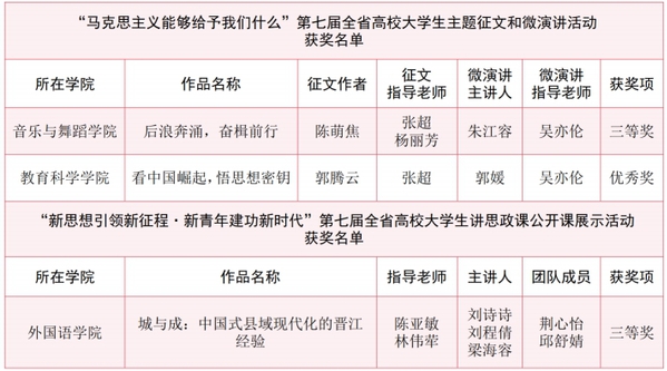 8月24日,中共福建省委教育工作委员会公布了福建省习近平新时代中国特色社会主义思想大学习领航计划系列主题活动获奖名单。我校荣获“马克思主义能够给予我们什么”第七届全省高校大学生主题征文和微演讲活动三等奖1项、优秀奖1项,“新思想引领新征程·新青年建功新时代”第七届全省高校大学生讲思政课公开课展示活动三等奖1项。