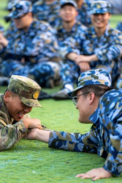 更多的军训休息间隙里,同学们三三两两席地环绕而坐,或是接过对面捎来的水杯,饮下烈日下的清凉,或是感动于身旁递来那张擦汗的纸,或是在彼此互相安慰、互相打趣的话语中得到身心放松,更有甚者,于“掰手腕”的较劲中昂扬斗志。军训的日子里,大家彼此依靠,共同成长,承诺温暖不止于此,未来亦将携手奋进。