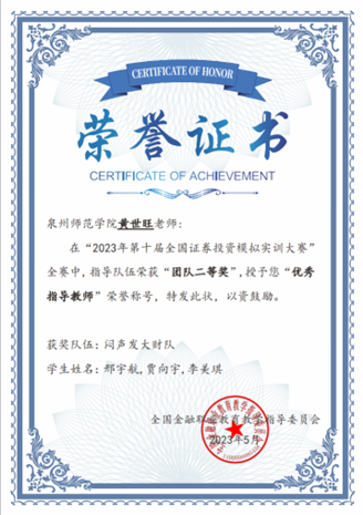 由全国金融职业教育教学指导委员会主办的“第十届全国证券投资模拟实训大赛”决赛近日落下帷幕。泉州师范学院陈守仁商学院在比赛中脱颖而出,邢宇航、贾向宇和李美琪等24名同学获得2023年第十届全国证券投资模拟实训大赛全国赛团队二等奖三项,三等奖五项,指导老师黄世旺博士获得了大赛“优秀指导教师”荣誉称号。据了解,全国证券投资模拟实训大赛是以证券业为背景,基于证券从业者所应具备的行业知识、基本业务技能及实操技能等设计的综合实训大赛。本次证券投资模拟实训大赛分本科组、职教组两个赛道,共有来自全国的本科院校296所13711支队伍(每队3人共41133人)、职教院校226所6500支队伍(共19500人)参赛。