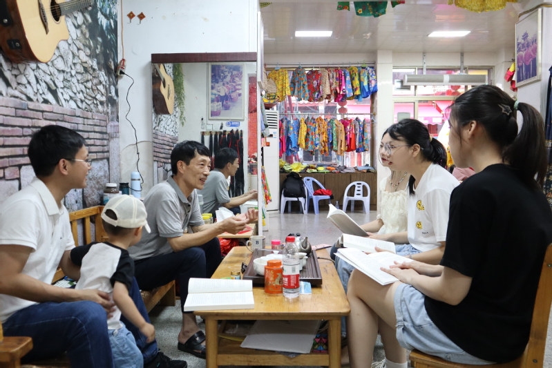 第一天,实践队采访了蟳埔服饰非遗传承人黄晨先生。黄晨先生向实践队的成员们详细介绍蟳埔村的历史和现状,为同学们展示了制作蟳埔服饰的步骤,针对实践队成员们的疑问进行答疑解惑。我们从访谈中了解到,蟳埔传统的簪花头饰上的每朵花代表了不同的含义,去每个人家中拜访时插的花的种类和数量也是有讲究的。在与黄晨先生的谈话中,我们感受到黄晨先生对蟳埔传统服饰技艺的坚持和热爱。在非遗传承工作室,实践队围绕“探寻蟳埔遗风,弘扬非遗文化”主题举办了一场蟳埔故事分享会,黄晨老师为队员讲述了蟳埔女的由来,实践队队长组织开展了一场读书分享会。