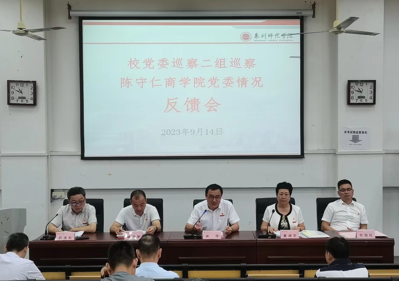 校党委巡察二组副组长林伟荦及有关同志,纪检监察室、巡察办、组织部有关同志,陈守仁商学院党委领导班子成员及相关同志出席会议。