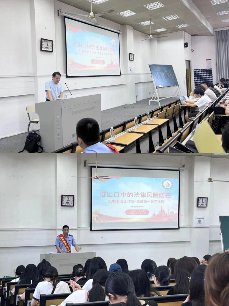 为扎实开展2023年党风廉政建设宣传教育月“一院一特色”----“清廉金融文化进校园”系列活动,提高经管类学生对进出口商务活动法律风险的防控意识,陈守仁商学院于11月2日在文科楼举办以“进出口中的法律风险防控”为主题的法制讲座。本次讲座由泉州海关缉私分局、丰泽打私办、丰泽公安分局、后渚海防派出所和陈守仁商学院联合举办,泉州海关缉私分局一科副科长邱水源主讲,商学院党委副书记曾文超主持。